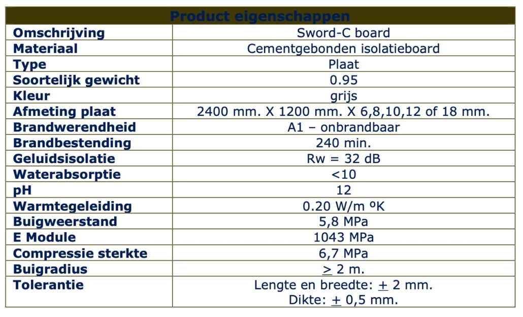Sword-C board is een lichtgewicht vezel versterkte cementgebonden plaat, geschikt voor vele toepassingen. Het kan zowel binnen als buiten gebruikt worden en is bestand tegen vocht en dampopen. Sword-C board is zeer licht in gewicht, heel makkelijk te bewerken, water- en brandbestendig en geluidsisolerend.